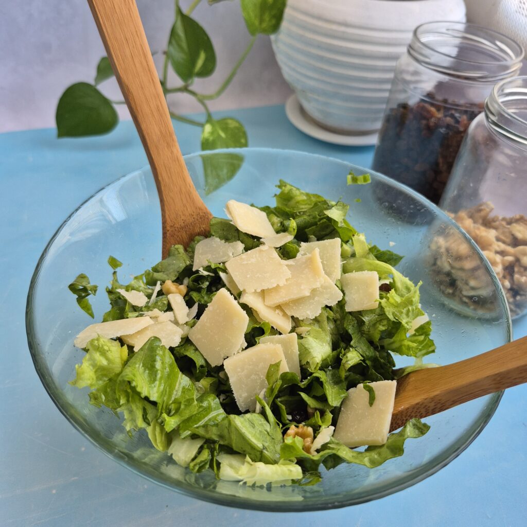 Ο συνδυασμός του τραγανού μαρουλιού με τη γλυκιά σταφίδα, τα καρύδια και την πικάντικη παρμεζάνα δημιουργεί ισορροπία γεύσης και υφής, ενώ το απλό dressing με ελαιόλαδο και ξίδι την απογειώνει.